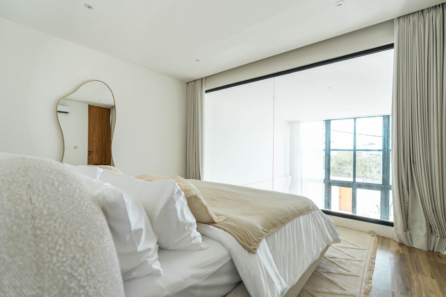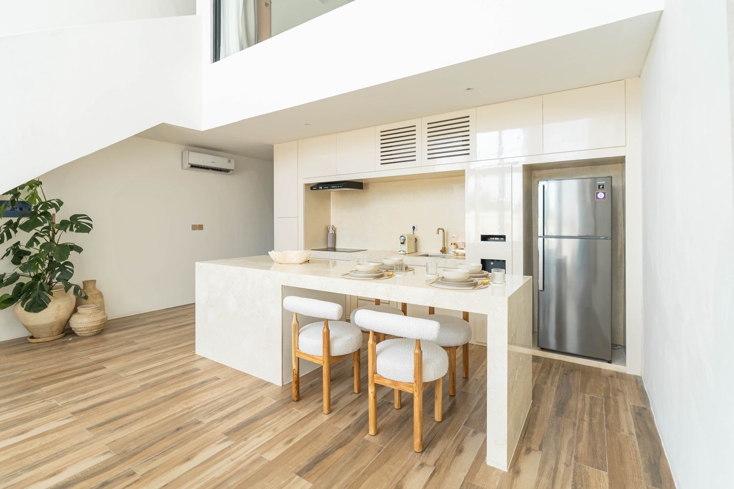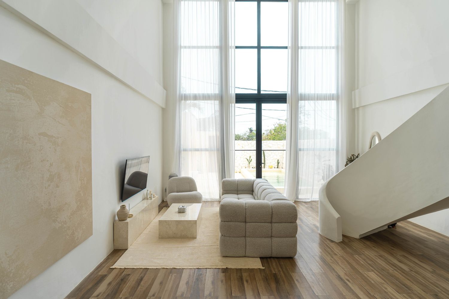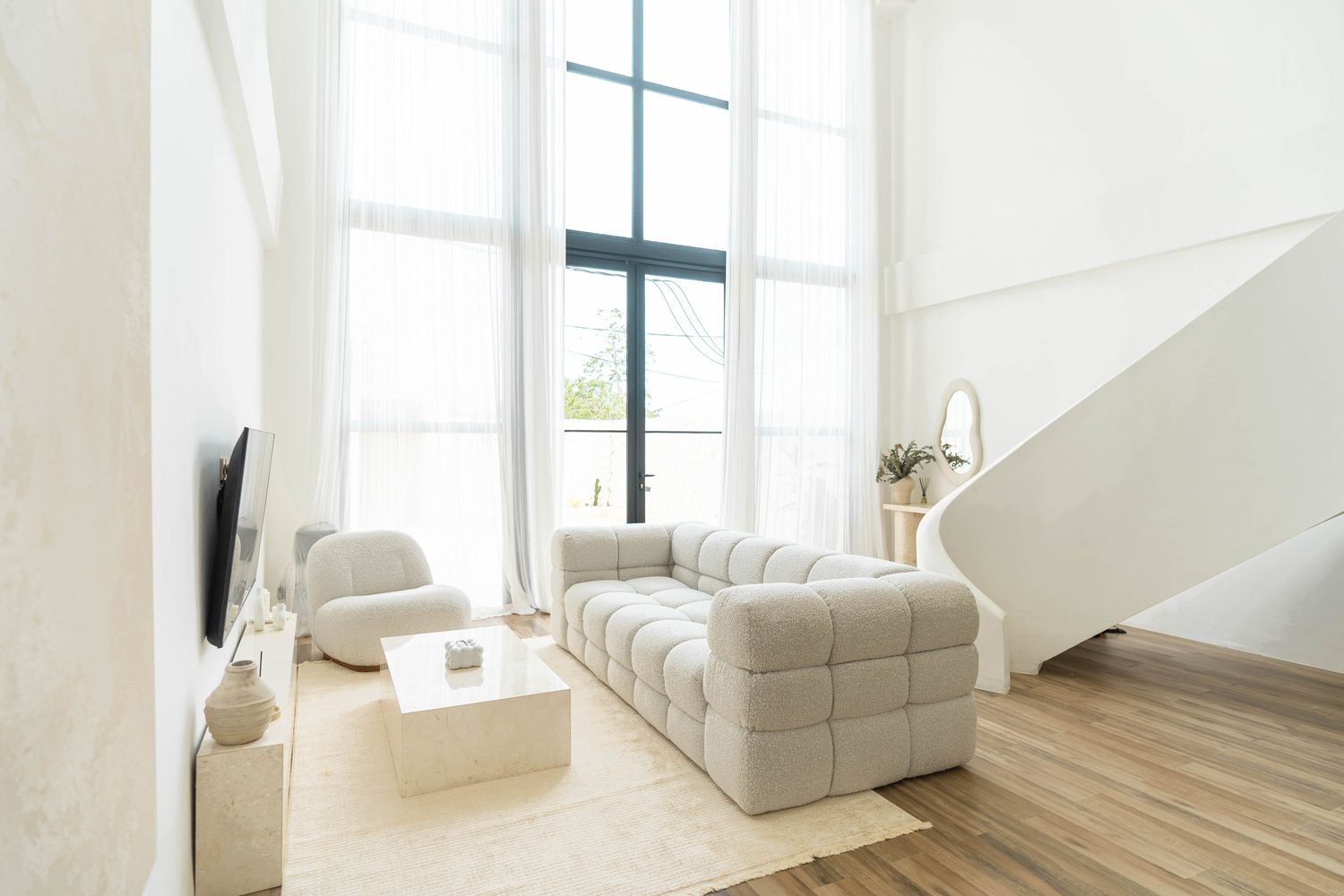Designed with soft bouclé furnishings and a palette of warm whites and natural textures, this villa offers a peaceful escape.